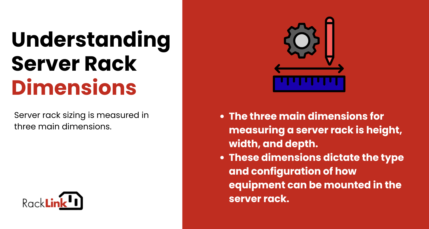 Server rack sizing is measured in three dimensions: height, width, and depth. These dimensions dictate the type and configuration of how equipment can be mounted in the server rack.